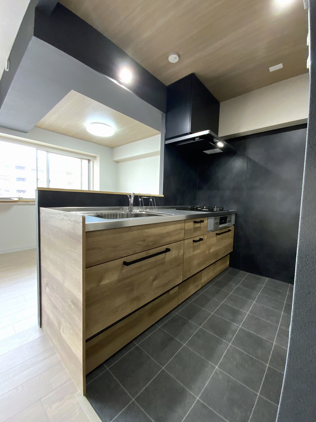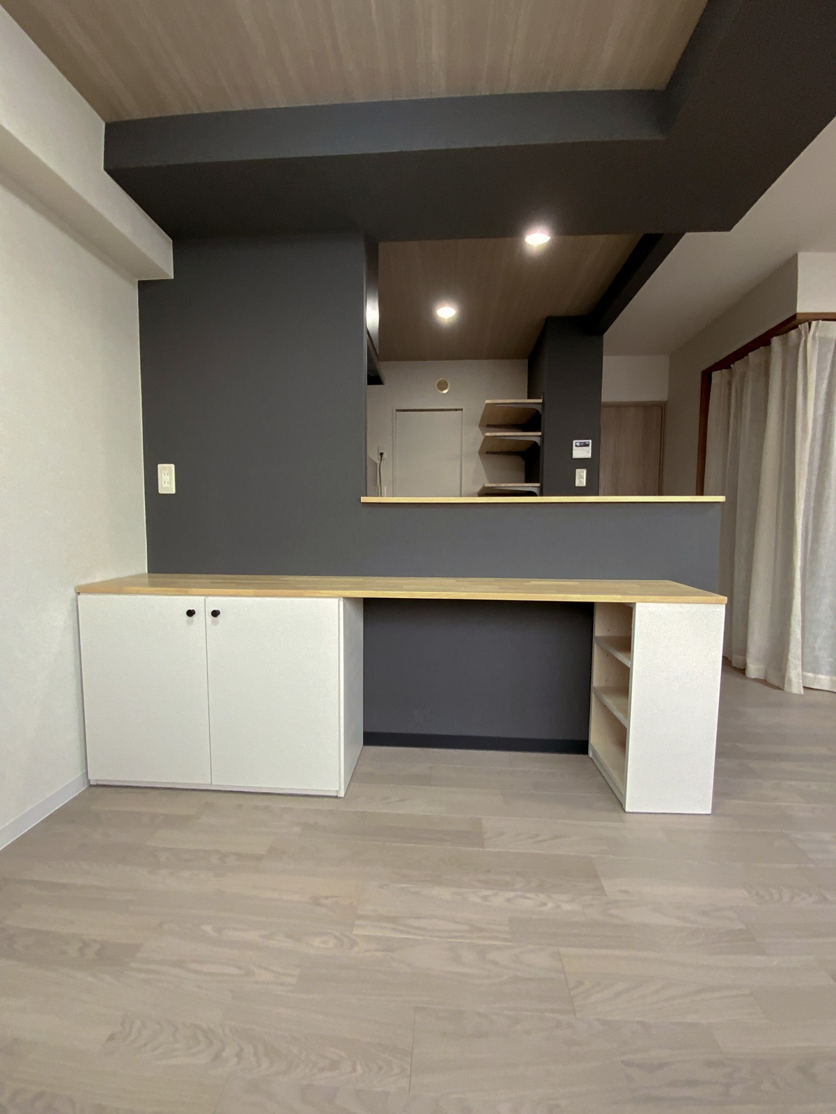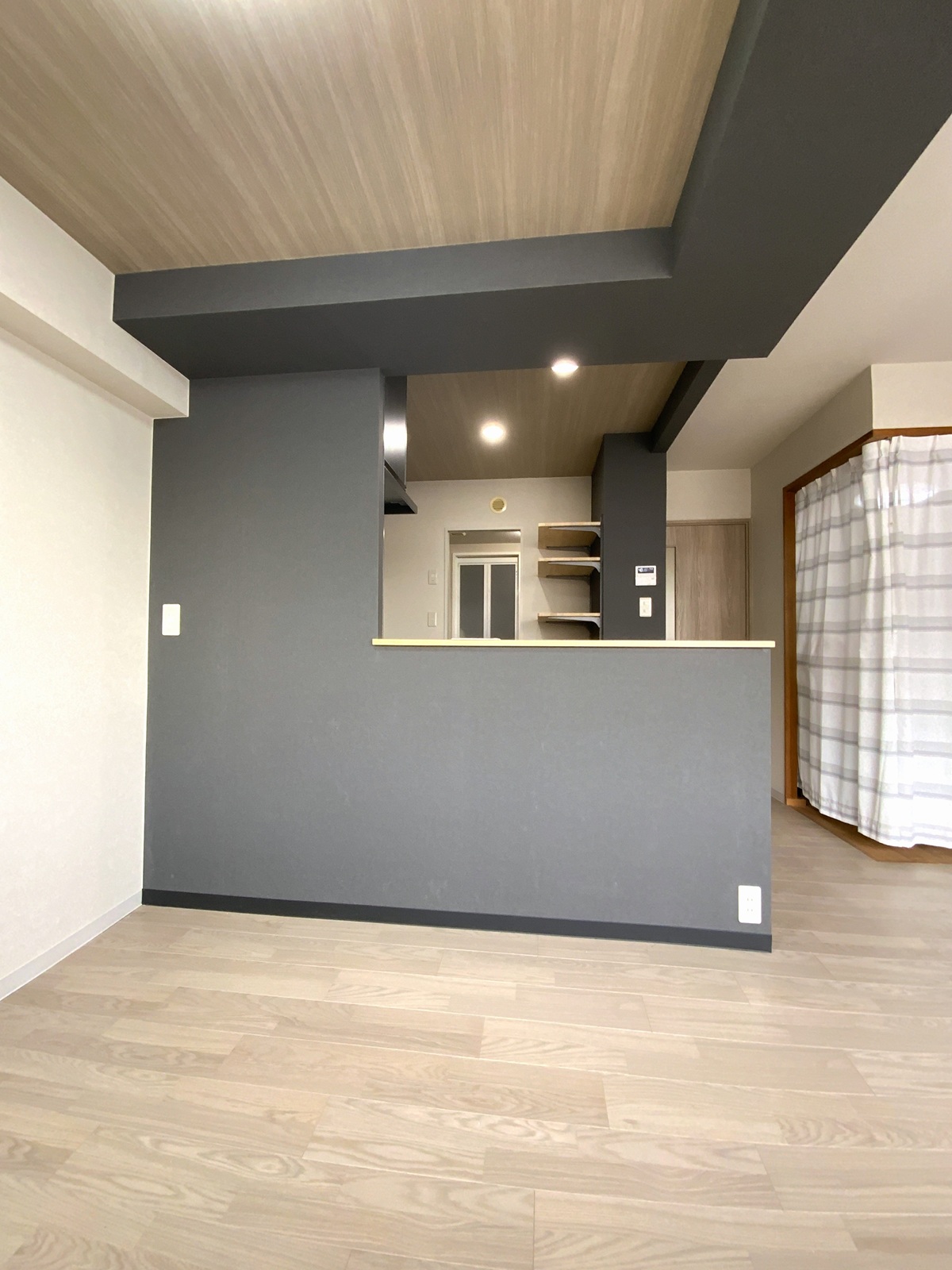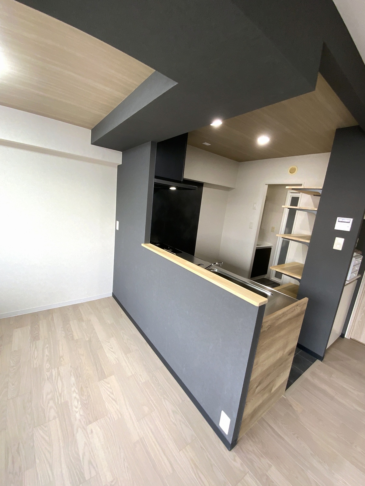 カウンター壁をブラックで仕上げ、マンション特有の梁をあえて際立たせました。 -