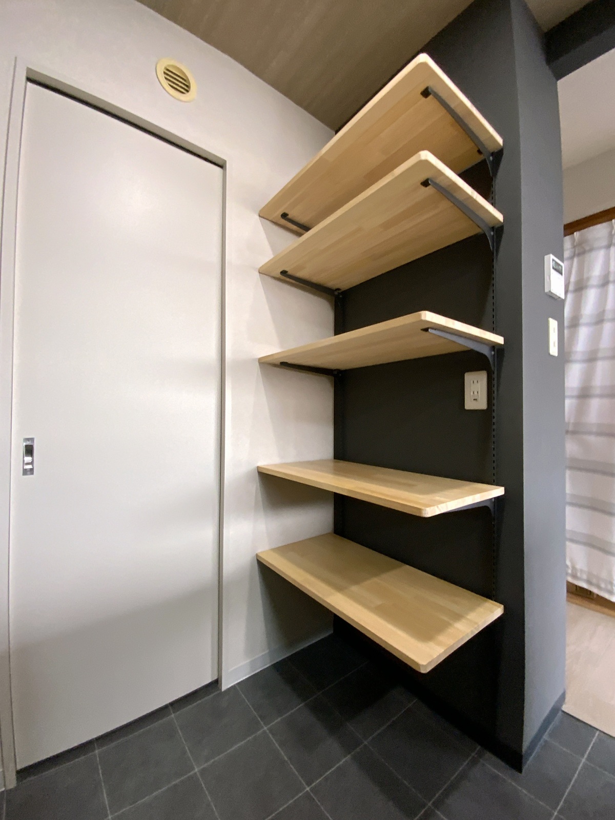 - クロスで表現する温かみ:壁面には、真っ白ではなくあえてトーンを抑えたベージュ(サンゲツ SP-2536)を採用。ブラックの梁や取っ手とのコントラストを和らげ、空間全体に落ち着きと上質な温かみをもたらしています。彩度を絶妙にコントロールすることで、モダンすぎず、かといって古臭くならない「洗練されたジャパンディ」な空間に仕上げました。