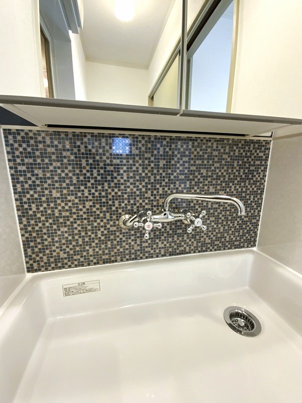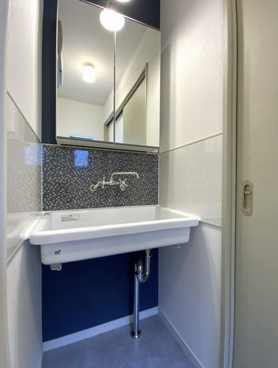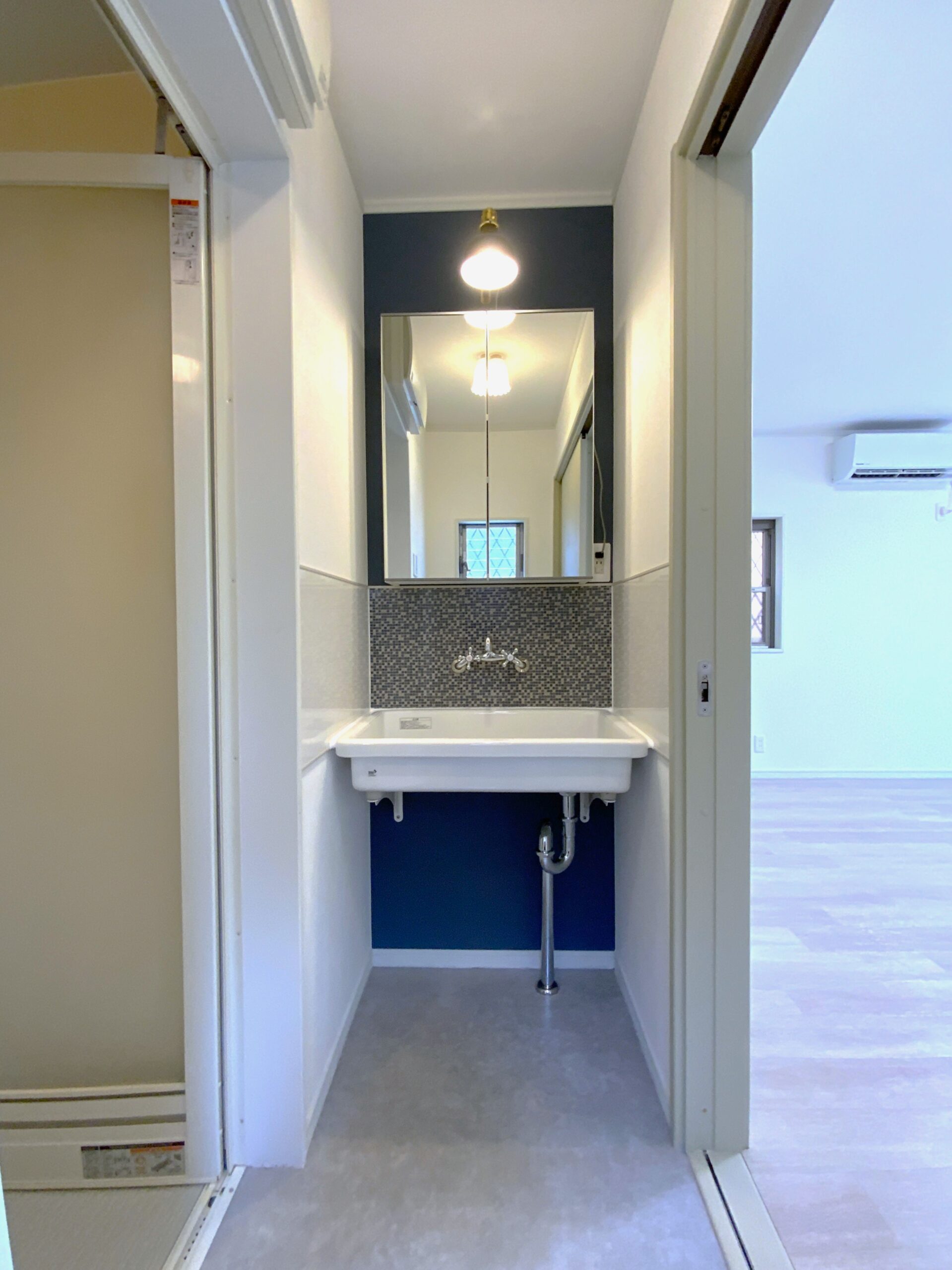 今回の現場では、実用的ながらお洒落なLIXILの実験シンクを採用しました。また壁付けのレトロな水栓、IKEAのミラー収納と照明を組み合わせて、デザインと価格のバランスを取りました。